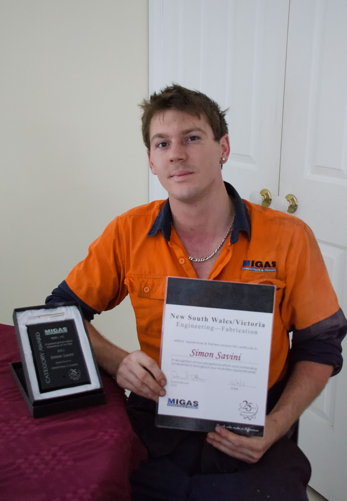 BELLAMBI apprentice Simon Savini has been named the 2012 Engineering Fabrication Apprentice of the Year at the NSW and Victorian Manufacturing Industries Group Apprenticeship Scheme (MIGAS) Awards Night earlier this month.