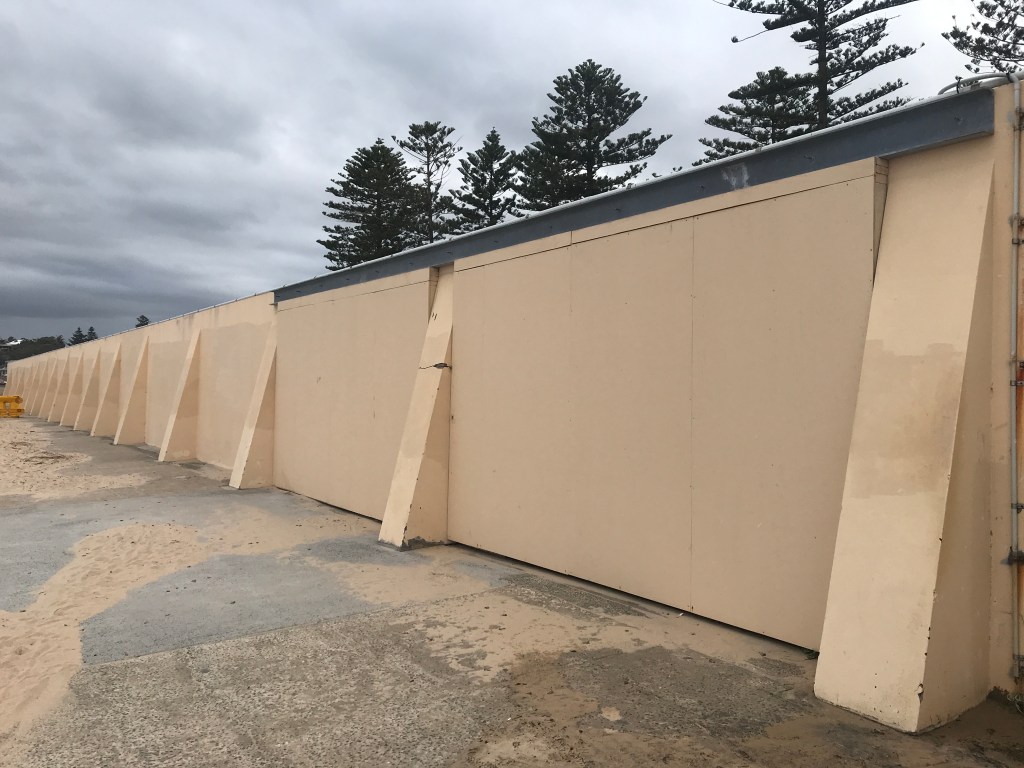 The panel, on the eastern side next to the showers and lifeguard facilities, was secured last season with a reinforcing beam and structural plywood as a precaution after cracks appeared in the brick panel’s render. It’s believed the cracks are the result of movement of sand under the concourse, which has reduced its structural integrity.
