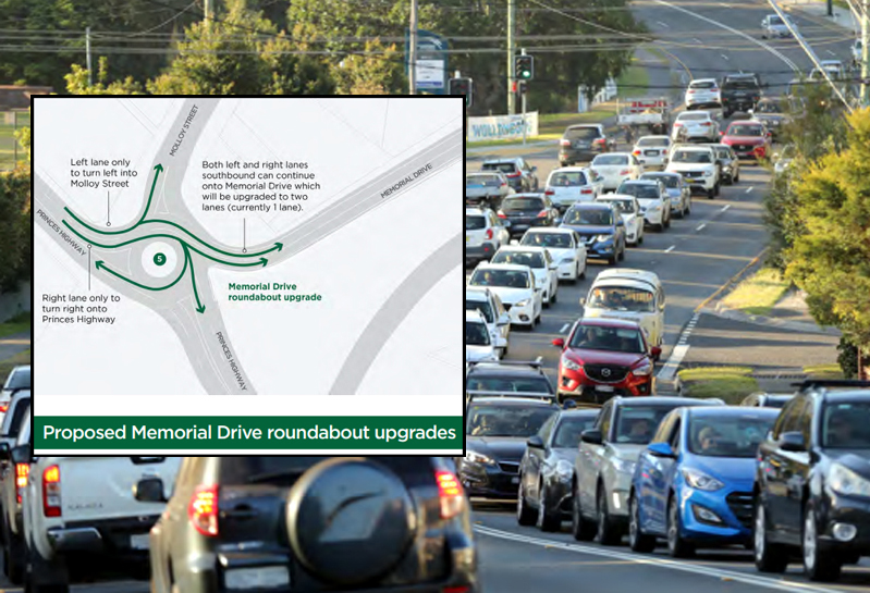 Work will begin to add an additional lane to the southbound on-ramp from the Princes Highway to Memorial Drive from Monday February 7. The roundabout upgrade is expected to take about six months, weather permitting.