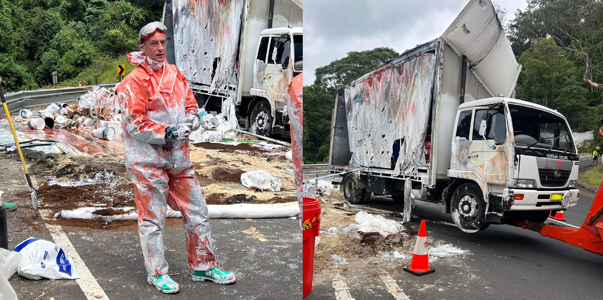 Emergency services crews responded to the truck accident, carrying six tonnes of paint, after it lost control and rolled spilling around 1000 litres of paint onto the road.