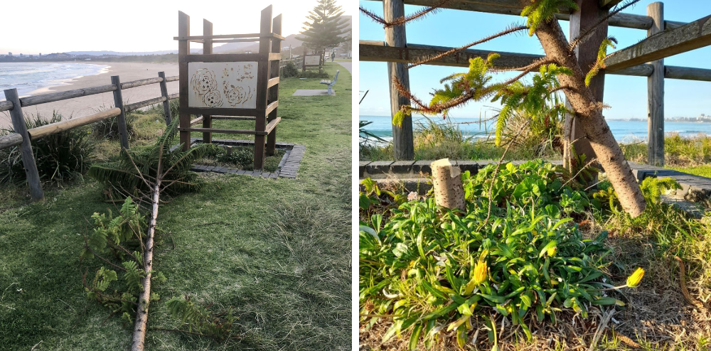 In 2021, several Norfolk Island pine trees were cut and poisoned (See The Bulli Clifton Times story: Selfish tree vandals strike again at Towradgi) in a previous act of vandalism. Council replaced the trees and installed large signs to serve as a visual reminder that tree vandalism of any kind will not be tolerated.