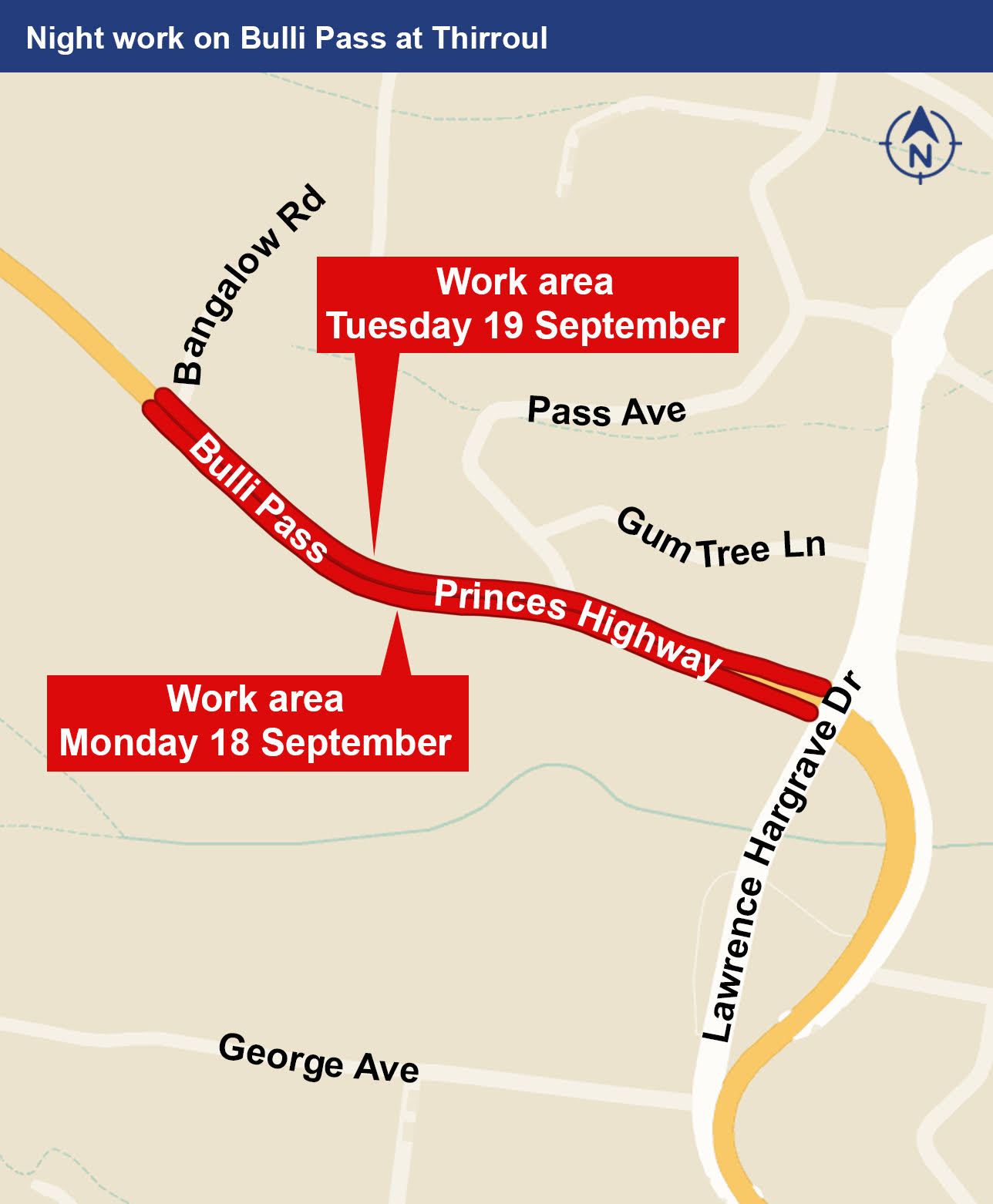 Work will be carried out on the Princes Highway between Lawrence Hargrave Drive and Bangalow Road, Thirroul for two nights from 8pm to 4am on September Monday 18 and Tuesday September 19, weather permitting.