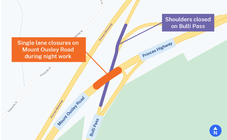 Single lane closures, traffic control and a reduced speed limit of 40 km/h will remain in place between 7pm to 7am, Sunday to Friday on Mount Ousley Road near the top of Bulli Pass until Thursday October 28, weather permitting.