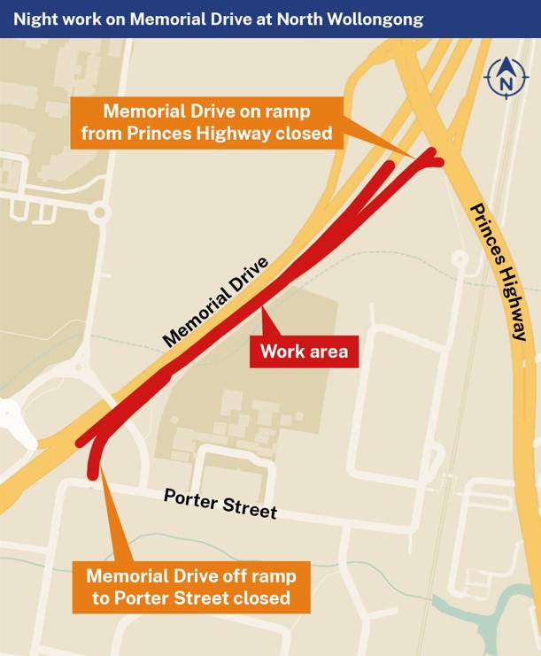 The southbound on-ramp to Memorial Drive from Porter Street in North Wollongong, and a 500 metre section of Memorial Drive, from the Princes Highway, will be repaired over two nights from 8pm to 4am on Wednesday October 18 and Thursday October 19, weather permitting.