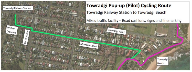The Towradgi pop-up cycleway connects the railway station to the beach and includes Speed cushions, bicycle road markings and signs on Murranar Road, Carters Lane and Weber Crescent.