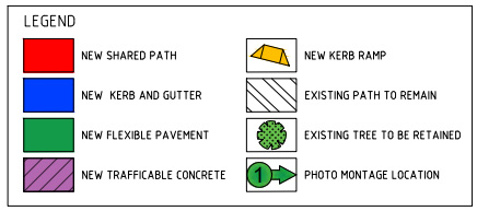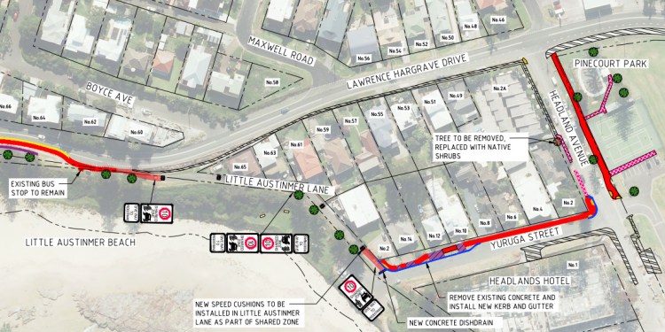 - Section 8 – the shared path will continue along the western side of Yuruga Street. This will include new driveways, kerbs, gutters and kerb ramps to connect to Headland Avenue. The shared path will then connect with Lawrence Hargrave Drive on the northern side of the Headland Avenue. Here, three footpaths will stem from the shared pathway for a section of Headland Avenue to provide access to Pinecourt Park and the tennis courts.