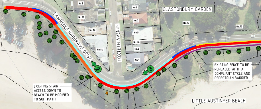 - Section 4 – a new shared path along Lawrence Hargrave Drive to the entrance of Little Austinmer Lane. A new concrete traffic barrier will replace the existing guardrail along the bend near Toxteth Avenue for safety.