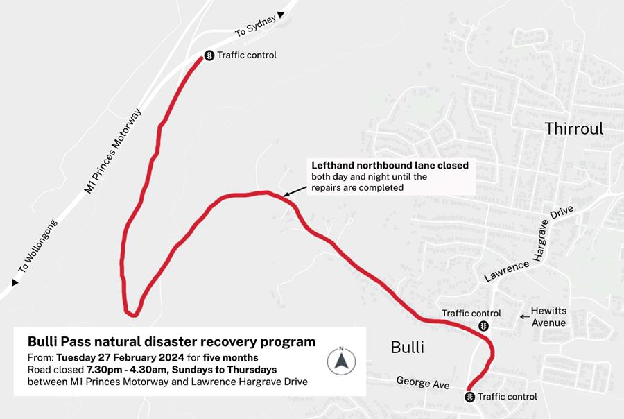 Bulli Pass will be closed to traffic in both directions, five nights per week for five months to repair landslip sites about the size of two Olympic swimming pools.