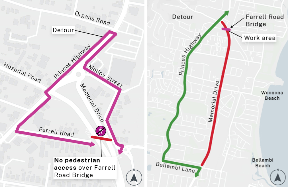 The pedestrian bridge over Farrell Road will be closed 24 hours a day for the duration of the work with detours in place via Farrell Road, the Princes Highway and Molloy Street.