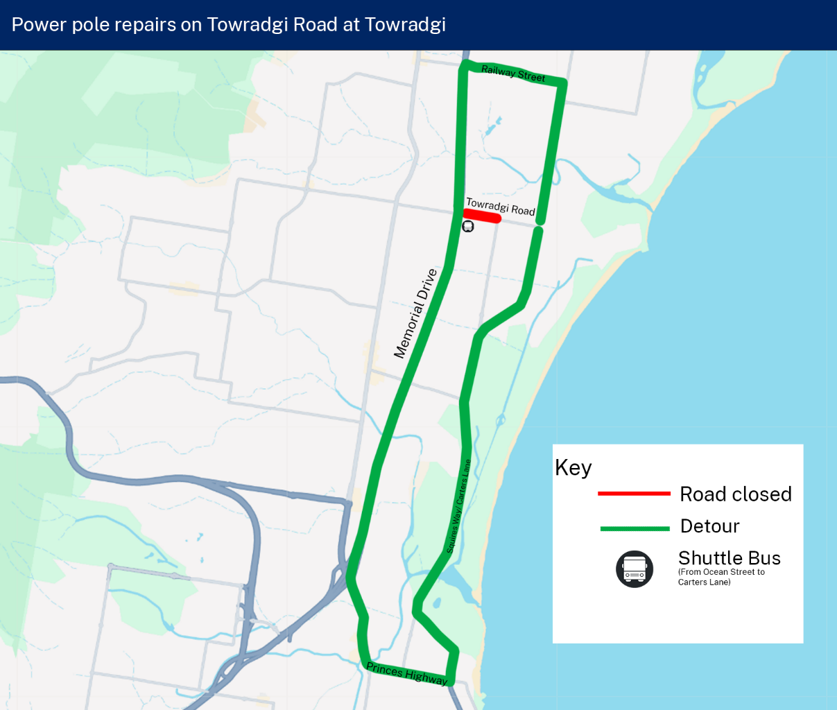 A detour will be in place via Railway Street to the north or Princes Highway, Bourke Street, and Squires Way/Carters Lane to the south to access the Towradgi east area. Motorists should allow up to ten minutes additional travel time.