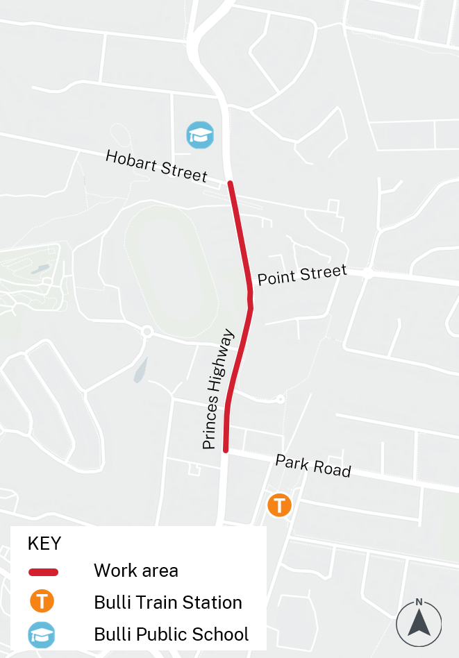 Work will be carried out on the Princes Highway between Park Road and Hobart Street at Bulli on Wednesday March 5, Thursday March 6 and Monday March 10, between 8pm and 4am, weather permitting.