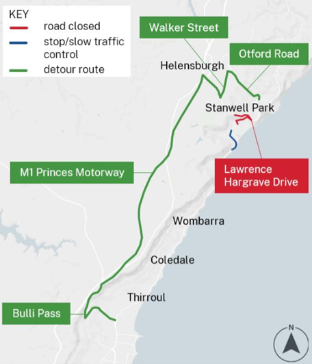 Detours will be in place via Bulli Pass, the M1 Princes Motorway, Walker Street and Otford Road.